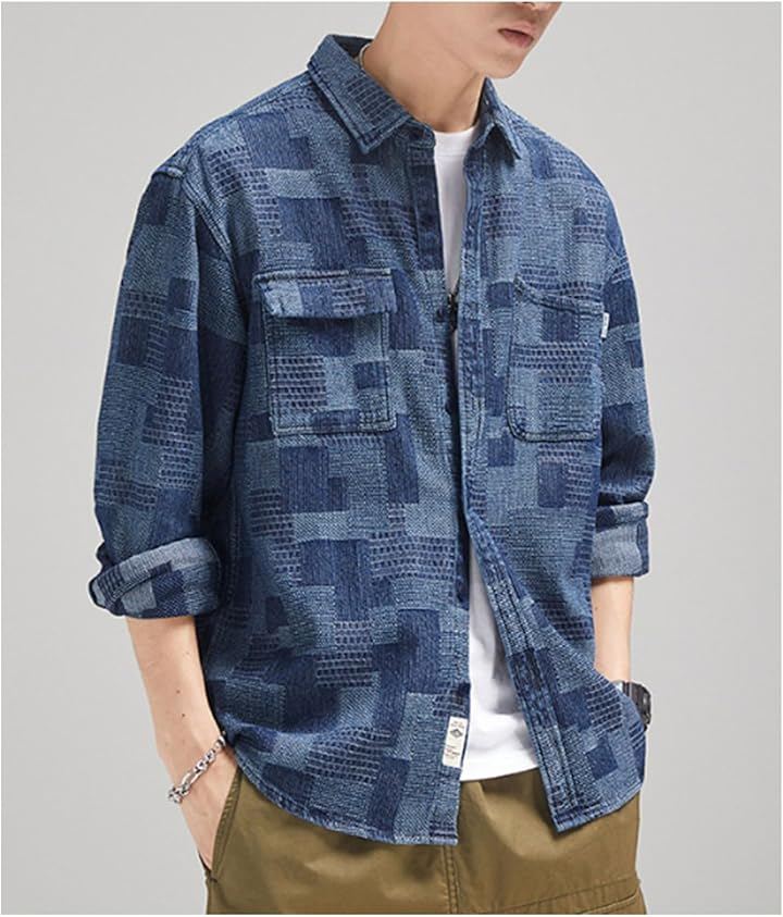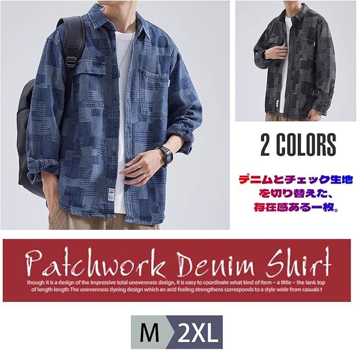 パッチワークデザインがお洒落なデニム風シャツ。