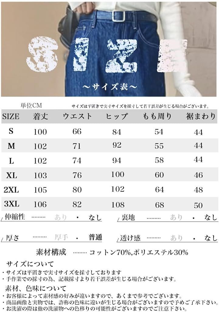 「サイズ 」Sサイズ:着丈 100cm、ウエスト66cm、ヒップ84cm、もも周り54cm、裾まわり44cm / Mサイズ:着丈102cm、ウエスト71cm、ヒップ92cm、もも周り55cm、裾まわり44cm / Lサイズ:着丈102cm、ウエスト74cm、ヒップ94cm、もも周り58cm、裾まわり44cm / XLサイズ:着丈103cm、ウエスト76cm、ヒップ100cm、もも周り60cm、裾まわり46cm / 2XLサイズ:着丈105cm、ウエスト80cm、ヒップ102cm、もも周り64cm、裾まわり48cm / 3XLサイズ:着丈106cm、ウエスト82cm、ヒップ108cm、もも周り68cm、裾まわり50cm