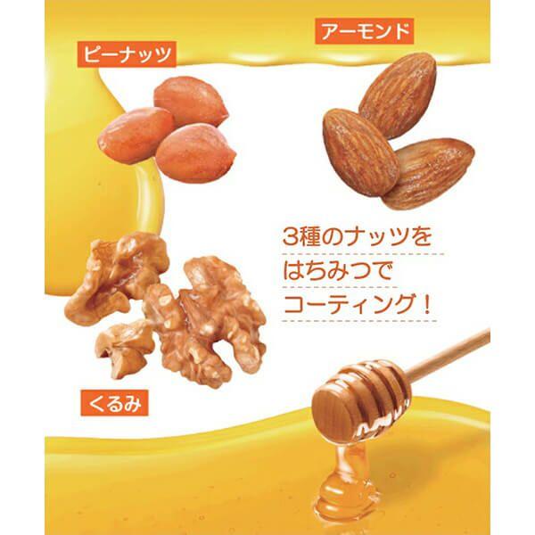 ■原材料名:ピーナッツ(アメリカ)、くるみ、アーモンド、ハニーバター風味シーズニング、還元水飴、植物油脂、はちみつ/トレハロース、糊料(アラビアガム、プルラン)、炭酸カルシウム、香料、甘味料(ステビア、スクラロース、甘草)、調味料(アミノ酸等)、乳化剤、ピロリン酸鉄、pH調整剤、(一部に乳成分・落花生・くるみ・アーモンド・大豆を含む)