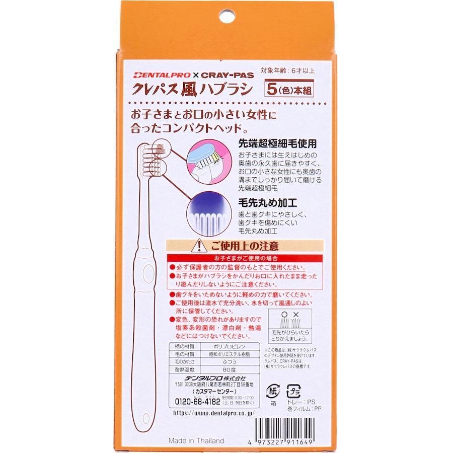 子どもも大人も楽しめる遊び心と機能性を備えたハブラシ!●先端 5穴超極細毛お子様には、生え始めの奥歯の永久歯に届きやすく、新しい歯を大切に磨く時期に最適です。お口の小さな女性には、虫歯になりやすい奥歯の溝までしっかり磨ける設計です。●毛先丸め加工歯と歯グキに優しく、 歯グキを痛めにくい毛先丸め加工。●指押さえ指押さえが親指にフィットし、手になじむハンドル形状。●握りやすいハンドル少し太めのグリックは、お子様や女性に握りやすい設計です。クレパス風に紙巻(水に強く剥がれ難い)フィルムに、印刷を施しました。※ハブラシで文字や絵はかけません。