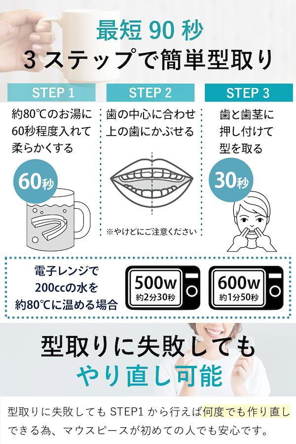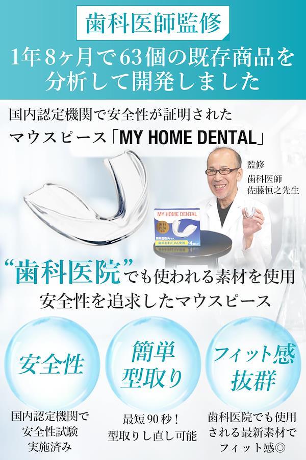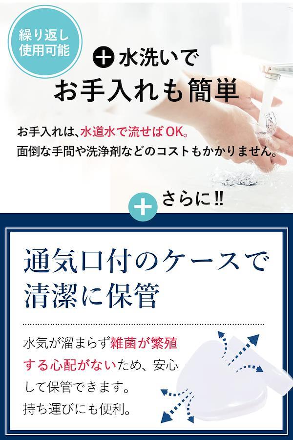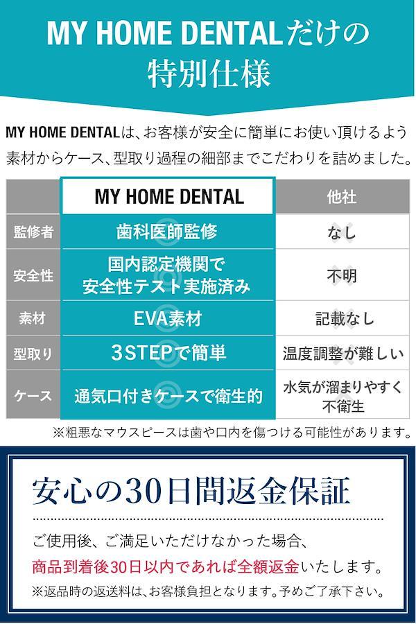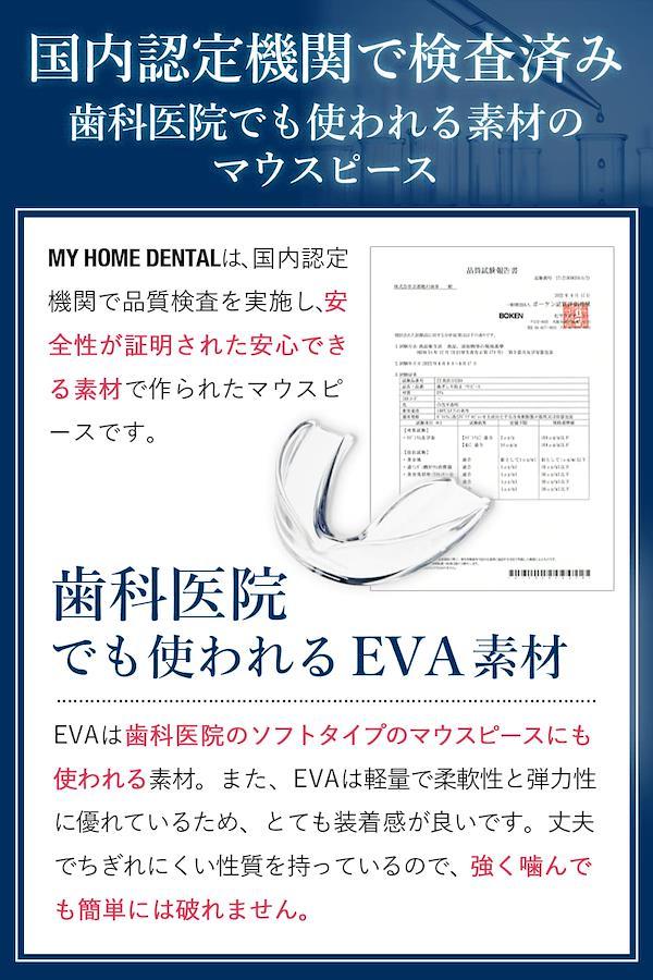 【違和感を感じないマウスピース】MY HOME DENTALのマウスピースは、自分の歯型に合わせて成型をおこなうので、装着時に違和感を感じません。フィット感抜群。 【超簡単!フィット感抜群マウスピース】MY HOME DENTALの自分専用のマウスピース。型取り必要、4個入り、専用ケース付き。 【型取り必要】自分の歯形で成型するからフィット感抜群、違和感ゼロ。作り方は、お湯に入れて柔らかくして歯型に合わせて型を取るだけ。作り直し、微調整が可能なので外れません。 【4個入り+ケース付き】専用ケースは通気性抜群。4個入りなので、万が一型取りに失敗しても安心。 【セット内容】型取りマウスピース×4・専用ケース×1・日本語説明書、【サイズ】フリー、【素材】本体材質:EVA樹脂・ケース材質:PP樹脂 【使用上の注意】以下の方のご使用はお控えください。※歯にぐらつきのある方、矯正中の方、入れ歯を使用中の方※歯や口腔内を治療中又異常のある方※鼻に疾患があり、鼻呼吸が困難な方※顎関節部や歯茎など痛みや異常がある方 【保管方法】使用前・使用後はマウスピースを水で洗浄した上で、口内が清潔な状態で使用してください。使用後は、日陰で乾かし専用ケースにいれて保管してください 。