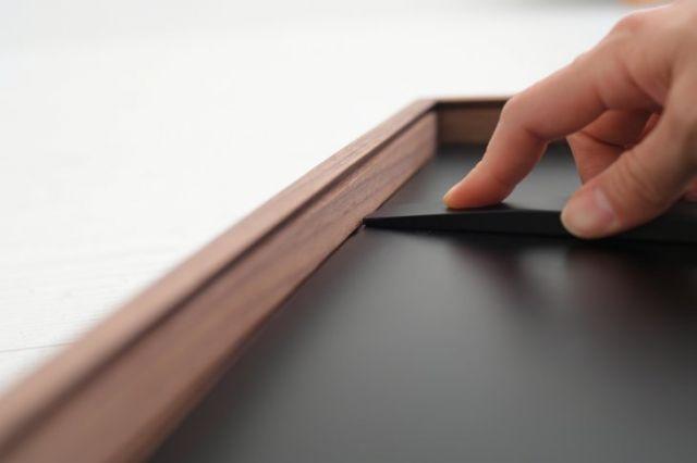 この額縁は写真や絵をより美しいものにするために、シンプルにデザインされています。しかし額縁として一番重要なこと、つまり、ガラスに写真や絵を確実に密着させることに、徹底的にこだわって設計されています。フレームのセットはフレーム背面の2本のストッパー木材をフレーム側の溝に固定します。