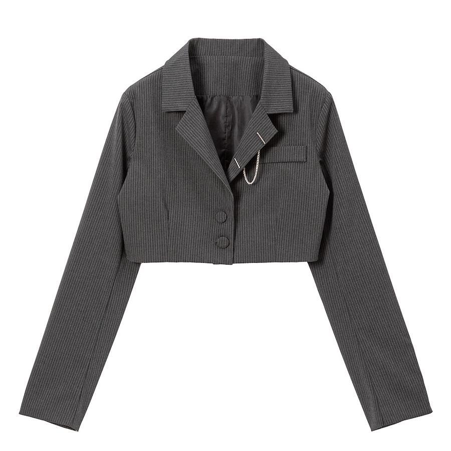 甘辛なディテールを落とし込んだクロップドジャケット【デザイン】エッジを効かせる袖口のシルバーホックと襟に施されたシルバーチェーンが特徴的なアイテム。やや深めのVネックで、釦を閉めても首周りがすっきり見える美シルエットが魅力!トレンド感あるクロップド丈でレディな雰囲気でご着用いただけます。チェーンは取り外し可能となっているので、お洗濯の際もストレスフリーなのが嬉しいポイントです。