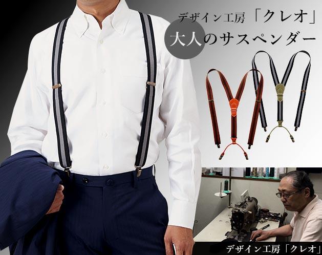 ★機能とフッション性を重視したダンディーな大人のサスペンダー!*スッキリと細く見えるボーダー柄、しっかりとした厚みが上質感漂う3cm幅のゴム生地は伸縮性抜群で肩への圧迫が少なく丈夫で長持ちします。アジャスターで長さの調整ができます。*前2点Y型後ろ二股クリップでしっかりとはさみ、動きやすく、スラックスのずり落ちを防ぎ、足元までスマートなシルエットを保ちます。*後ろのクロス部分と二股留め金具部分に丈夫な牛革を使用白糸ステッチに金具はアンティークゴールドカラーとデザインの細部にもこだわっています。*上着の下に、カジュアルなシャツの上に等、ビジネスからカジュアルまでご使用できます。*伸縮性の高いボーダー柄のゴム生地と、つなぎ目に丈夫な牛革を使用。*ポッコリお腹の窮屈でダブつく胴回りが快適でスマートなシルエットに。◇大久保弘道代表工房「クレオ」による絵型からパターン、裁断までの一貫仕上げ大手鞄ブランドメーカーのサンプルメイキングを託されており、その仕事ぶりがマスコミにも取り上げられた、この道40年のベテランです。