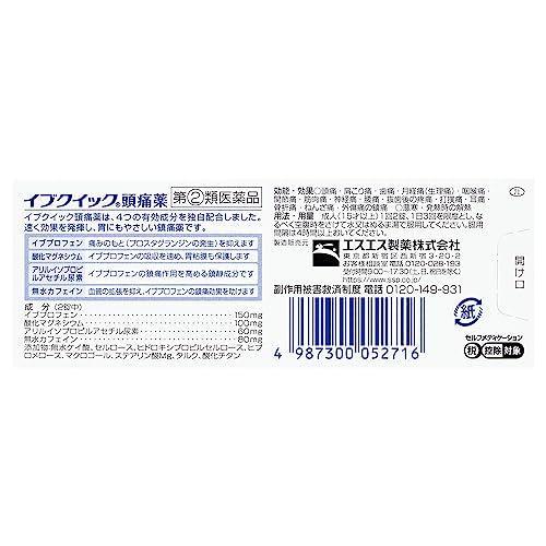 解熱鎮痛薬イブプロフェン配合製剤●イブクイック頭痛薬は、頭痛にしっかり効くよう設計された製剤です。イブプロフェンをはじめ、その鎮痛効果を高めてくれるアリルイソプロピルアセチル尿素・無水カフェイン、さらに、胃粘膜を保護するとともにイブプロフェンの吸収を促進する成分酸化マグネシウムを配合しました。○独自処方が鎮痛成分の吸収を促進するため、頭痛のもとに速く優れた効果を発揮します。○胃にやさしい胃粘膜保護成分を配合しています。医薬品は、用法用量を逸脱すると重大な健康被害につながります。必ず使用する際に商品の説明書をよく読み、用法用量を守ってご使用ください。用法用量を守って正しく使用しても、副作用が出ることがあります。異常を感じたら直ちに使用を中止し、医師又は薬剤師に相談してください。 内容量:60錠