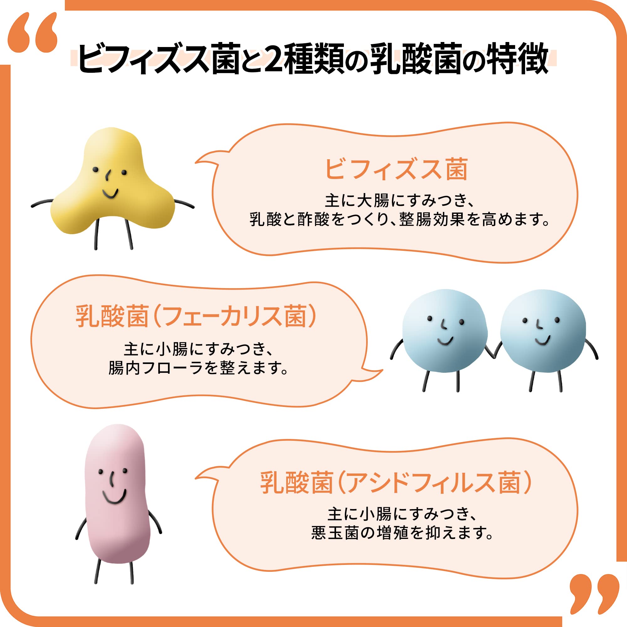●バランスよく配合された3種乳酸菌の働きにより小腸から大腸まで腸の調子を整えることができます。