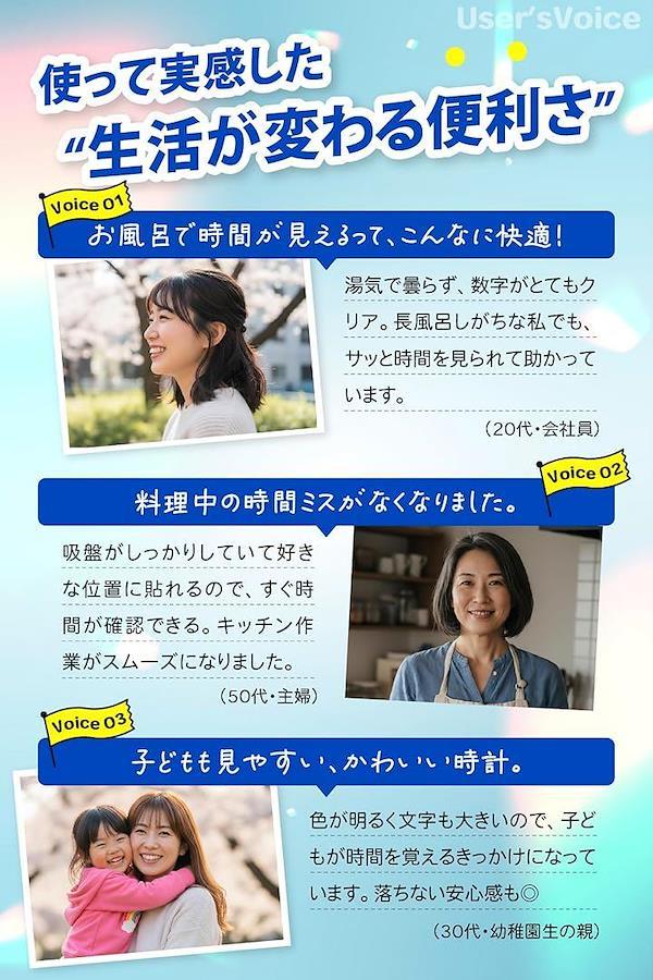 また、置き時計としても使用可能なので、浴室以外の場所にもマルチに対応できます。