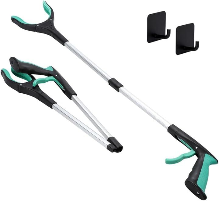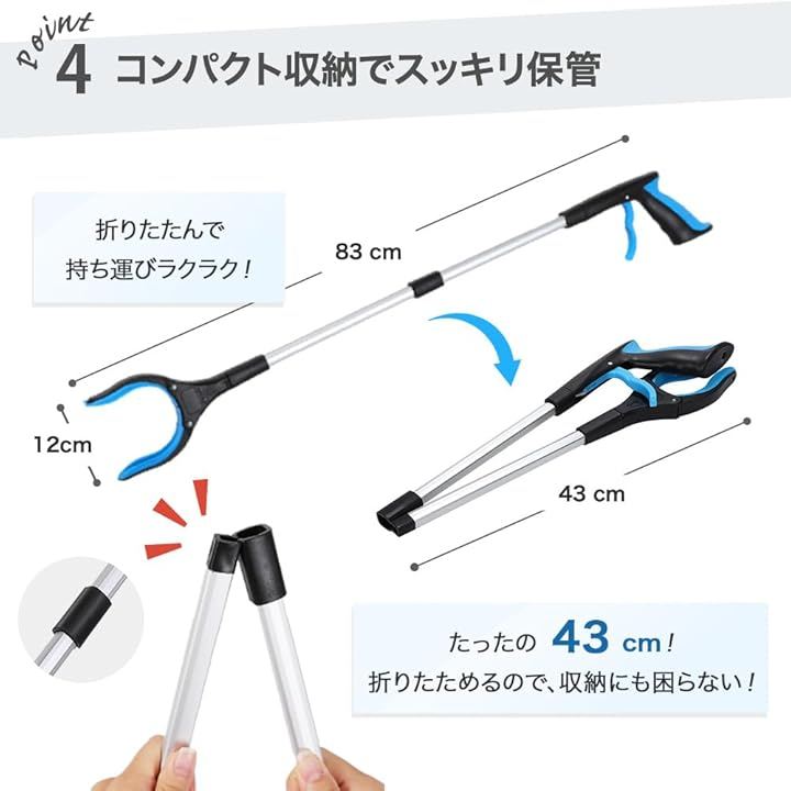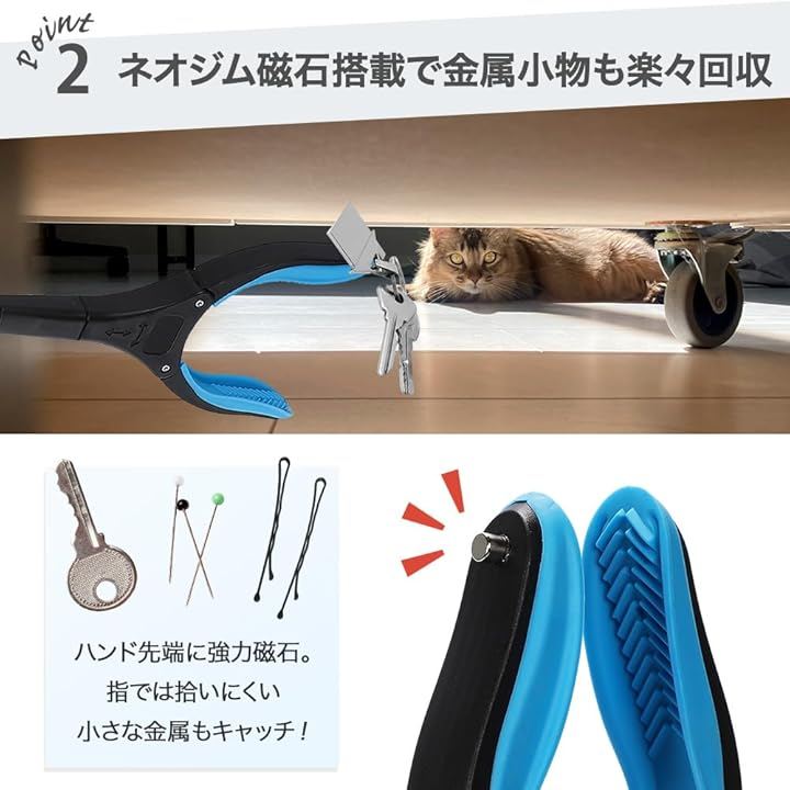 「ラクな姿勢で物が取れるロングリーチャー」約83cmの長さで、床や高所にある物も立ったまま楽にキャッチ。
