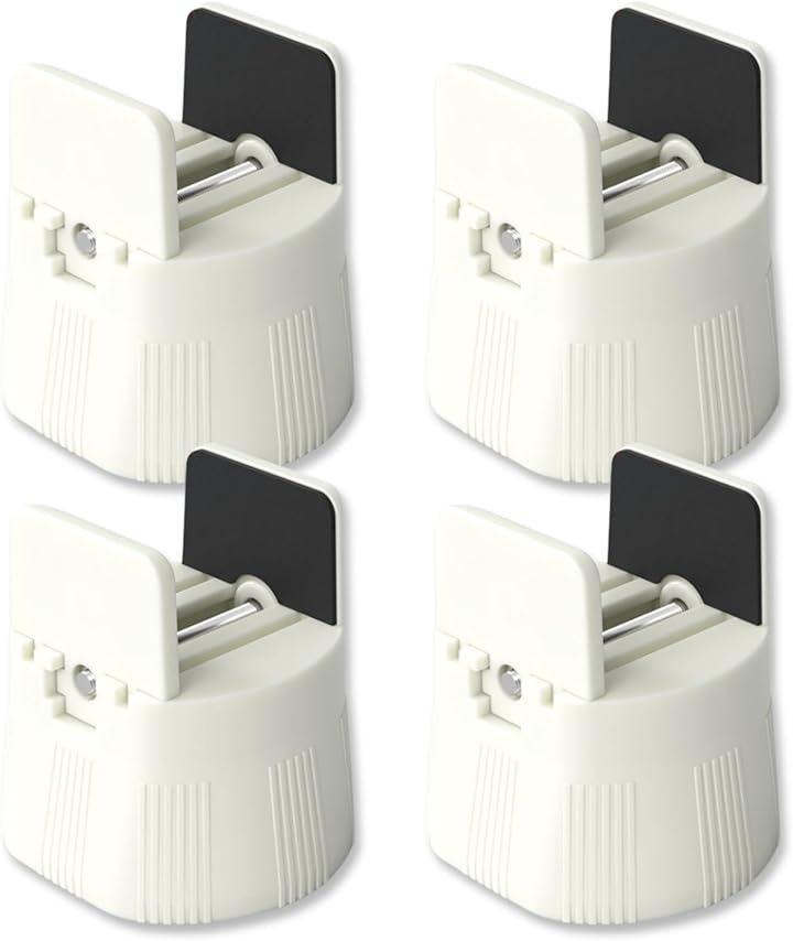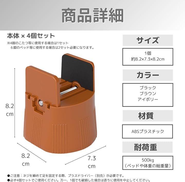 「商品詳細」本体x4個 サイズ:(1個)約8.2x7.3x8.2cm(底上げ5.2cm) 材質:ABSプラスチック カラー:ブラック / ブラウン / アイボリー 耐荷重:500kg(ベッドや体重の総重量) *4脚のこたつ等に使用する場合は1セット、6脚のベッド等に使用する場合には2セット必要になります。