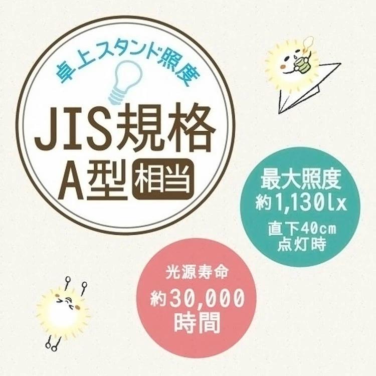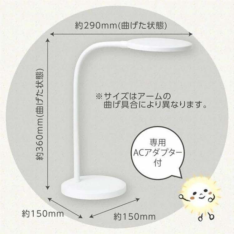 ★円形のライトが全体を面でふわりと照らすのでギラつかず、昼白色で目が疲れにくい。★スイッチひとつでオン・オフ&調光可能。複雑なボタンなくシンプルに使えます。★無段階調光で、お好みの明るさにスイッチ長押しで調整できます。★ぐねぐね曲がるフレキシブルアームは角度も位置も自由自在。衝撃に強くこわれにくい。★卓上 スタンド照度 jis規格 a型相当★光源寿命 約30,000 時間★最大照度 約1,130lx (直下40cm 点灯時)★専用acアダプター付