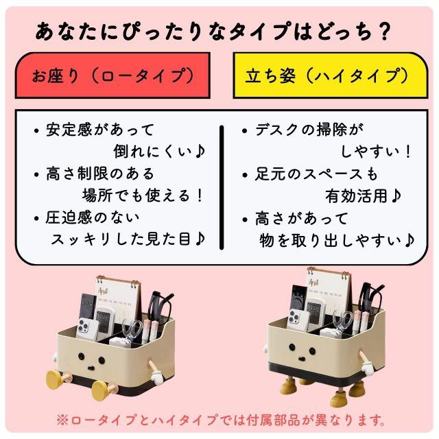 ]●選べる2タイプ。置く場所に合わせて高さが選べるから、どこでもピッタリ。※ロータイプとハイタイプで付属部品が異なります。