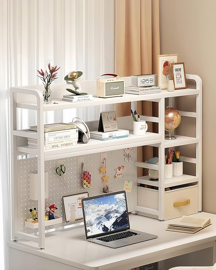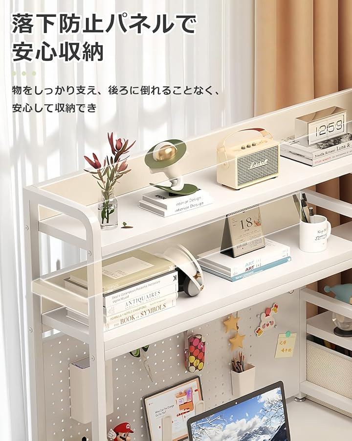 「抜群の収納力と多用途」この卓上ラックは、複数段の棚板でデスク上の垂直空間を効率よく活用するコンパクト設計。