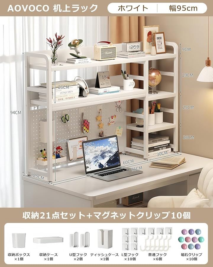 「豊富な付属アクセサリで使い勝手抜群」デスクラックは収納ボックス、U字フック、L字フック、マグネットなど、さまざまなアクセサリが付属しています。