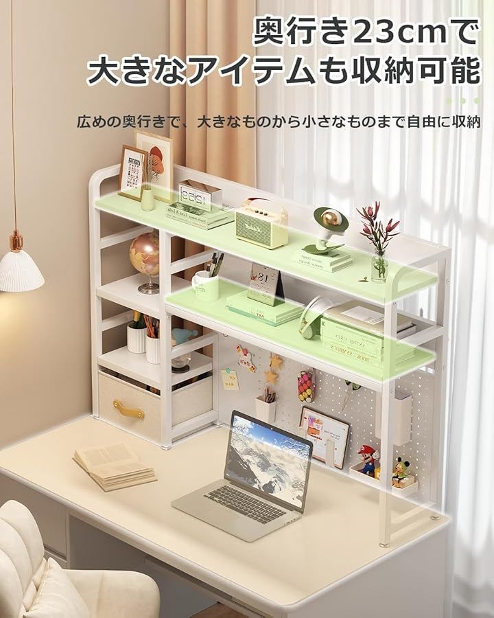 「有孔ボードで自由にカスタマイズ」デスク上置き棚に搭載されたパンチングボードを活用することで、イヤホンやキー、小物をフックやマグネットで自由に吊るして整理できます。