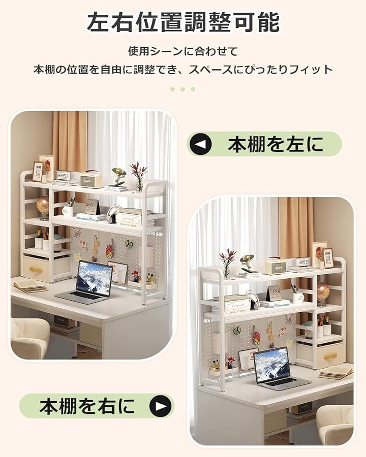 本棚の位置は左右に調整可能で、デスクにぴったりフィットします。