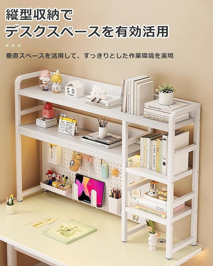 「抜群の収納力と多用途」この卓上ラックは、複数段の棚板でデスク上の垂直空間を効率よく活用するコンパクト設計。