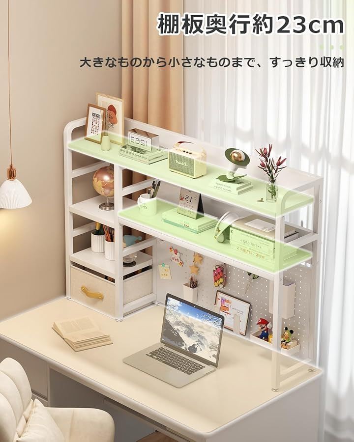 「有孔ボードで自由にカスタマイズ」デスク上置き棚に搭載されたパンチングボードを活用することで、イヤホンやキー、小物をフックやマグネットで自由に吊るして整理できます。