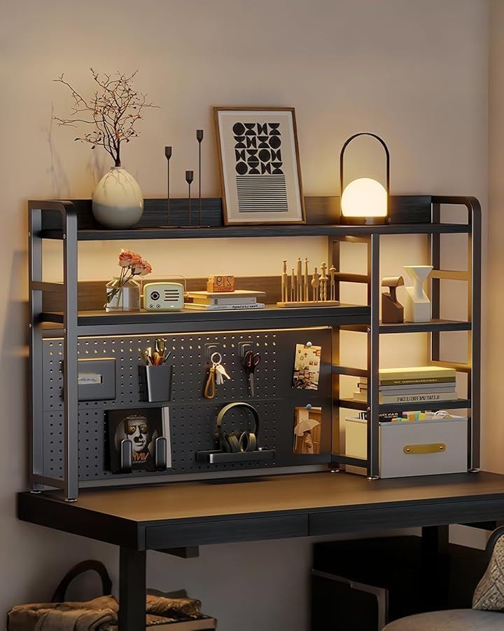 「有孔ボードで自由にカスタマイズ」デスク上置き棚に搭載されたパンチングボードを活用することで、イヤホンやキー、小物をフックやマグネットで自由に吊るして整理できます。