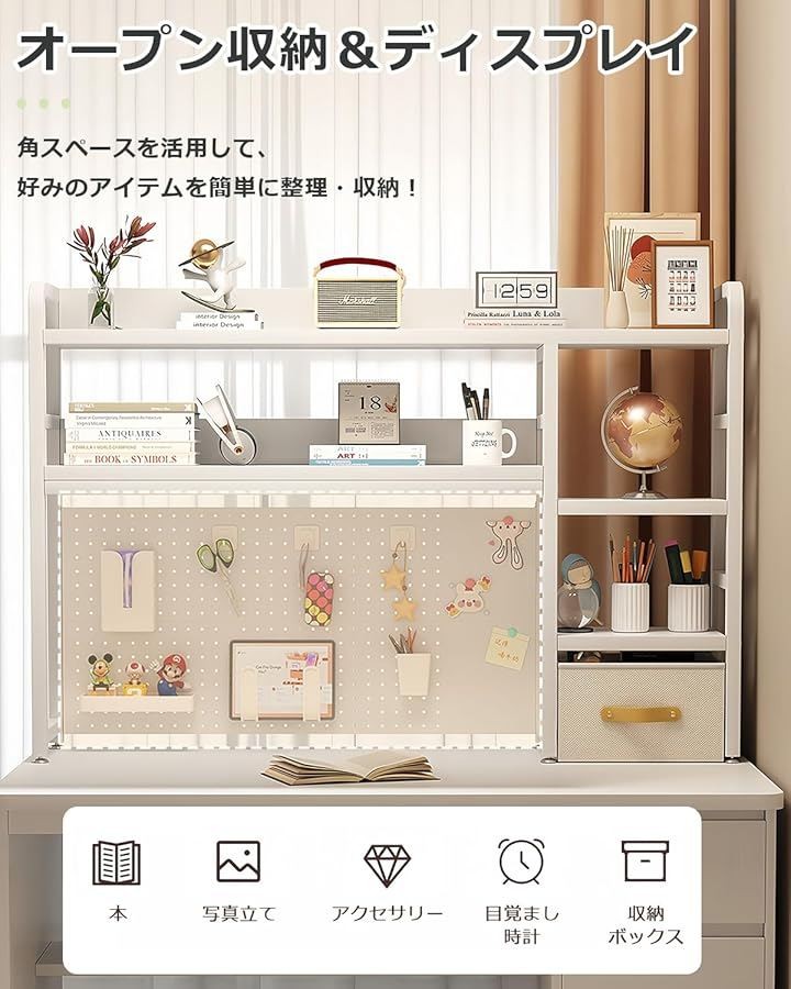「簡単組み立てと調整可能な機能」卓上収納ラック事前に穴が開けられているため、ドライバーでネジを締めるだけで簡単に組み立てられ、面倒な工具や専門知識は必要ありません。