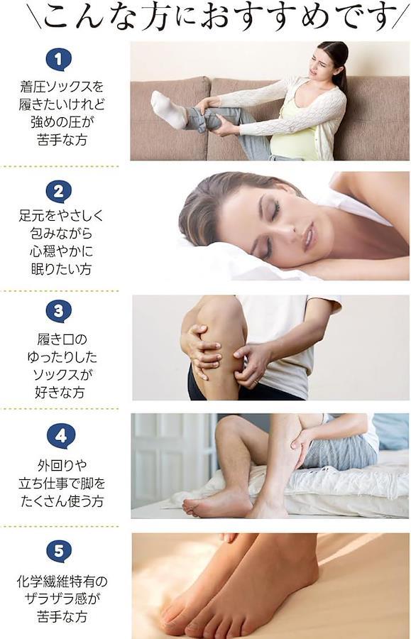 対象:「足が重く怠い方」「夜に足が冷える方」「立ち仕事やデスクワーク、長時間の移動で足が疲れている方」「足の疲れが残りやすい方」「眠りの質を向上させたい方」