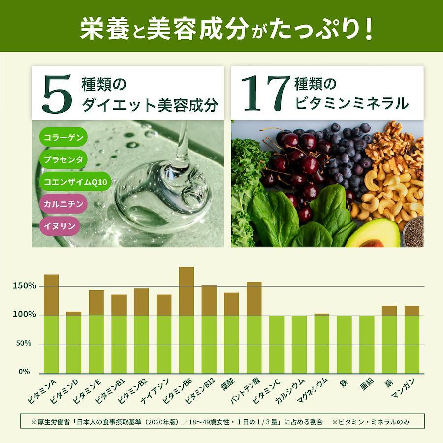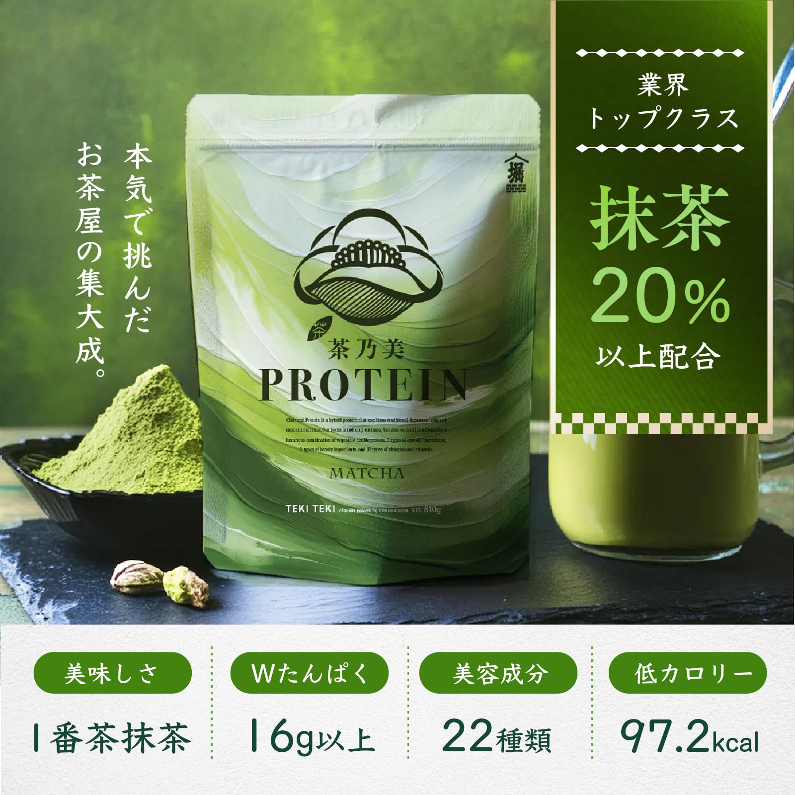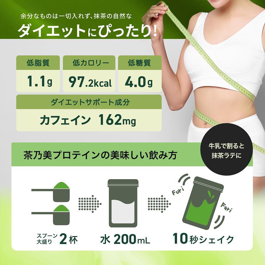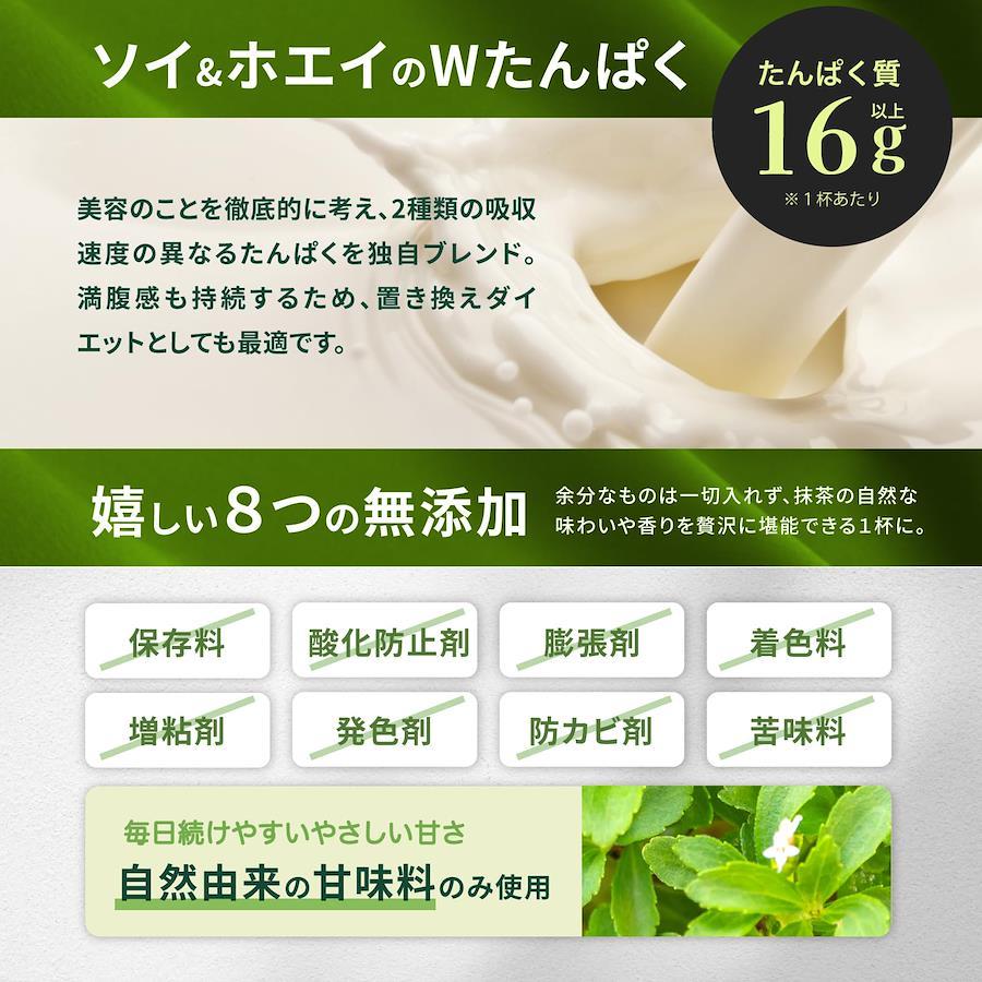 【希少性・栄養価の高い一番茶 抹茶 使用】 最も栄養価が高く・美味しいとされる時期に収穫し、伝統的な方法で丁寧に加工している一番茶 抹茶 100%。さらに、伝統的なレンガ造りの本格碾炉(てんろ)で、風を当てることなく熱だけで、じっくりと乾燥させることにより、香りを最大限に引き出しています。?【高品質 タンパク質 16g以上】 美容 のことを徹底的に考え、2種類の吸収速度の異なる たんぱく ( ソイプロテイン & ホエイプロテイン )を独自ブレンドしています。さらに、満腹感も持続するため、 置き換えダイエット 、 プロテインダイエット としても最適です。?【1杯で22種類の ダイエット ・ 美容 ・ 健康栄養素】 1杯で完結できるように、『5種類の ダイエット ・ 美容 成分』『11種類の ビタミン &6種類の ミネラル 』を贅沢に配合しております。日々の栄養バランスから ダイエット ・ 美容 まで、全てをトータルサポートします。?【嬉しい8種の 無添加 】 余分なものは一切入れていません。だからこそ 抹茶 の自然な味わいや香りを楽しむことができる1杯です。さらに植物由来の甘味料のみ使用しております。(保存料、発色剤、防カビ剤、苦味料、膨張剤、調味料、増粘剤、着色料)?【内容量・使用用途】 内容量は270g。約200mlの水を入れ、専用スプーン2杯を入れて、10秒ほどシェイクして完成です。 抹茶ラテ を味わいたい方は、牛乳で割って飲んでください。 置き換えダイエット や ダイエットに挑戦したい方、 抹茶 好きな方、綺麗であり続けたい方におすすめ。シェイカーは付属しておりません。食品のため、交換・返金はお受けできません。ただし、不良品の場合は弊社に商品をお送りいただき、確認後に、交換または返金をさせていただきます。【免責事項】メーカーによる商品リニューアルに伴いパッケージ(内容量も含む)変更が行われた場合、新パッケージでお届け致します事ご了承願います。