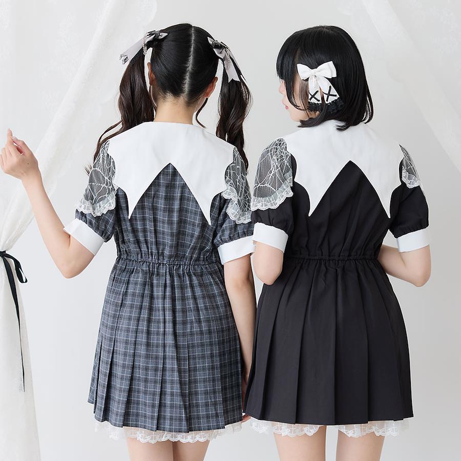 悪魔デザイン襟がかわいすぎる闇ワンピース♪【デザイン】大人気のデビル襟ブラウスがワンピースになって登場肩部分は蜘蛛柄レース重ねて、肌チラッと見えるのもかわいい♪十字架柄のレースフリルもデザインのポイントになりますデビル襟とフリルは配色になっていますパープルチェックとグレーチェックのカラバリもあります【素材】しっかりとした素材になっています。本体に裏地付き、脇ポケット付きです。釦とウエストゴムで着脱可能。【コーディネート】地雷系や闇系コーデにぴったりのワンピースです。後ろ姿も映えるデザインなので、双子コーデにもオススメです。《透け感》なし 《生地の厚さ》普通 《裏地》あり 《伸縮性》なし《生産国》中国