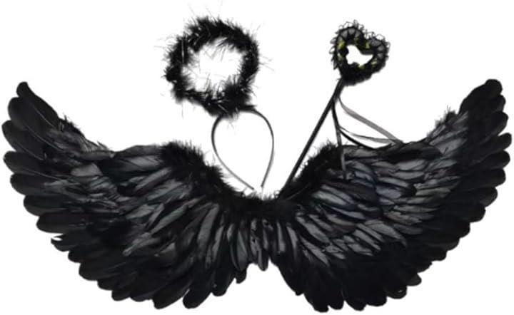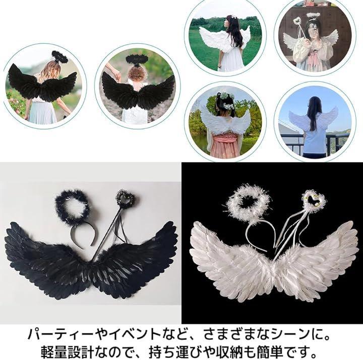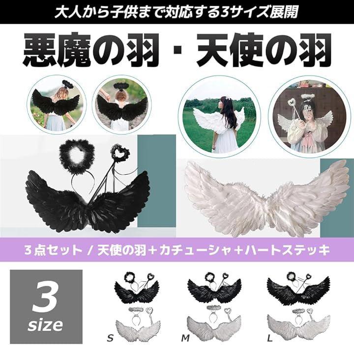 「素材」フェザー「カラー」ホワイト、ブラック「サイズ」S:65cmx35cm、M:80cmx40cm、L:110cmx45cm「適用身長 」 S:80~120cm、M:110~150cm、L:140cm以上 「重量」S:80g、M:110g、L:220g 「内容品」3点セット/天使の羽+天使のカチューシャ+ハートステッキ