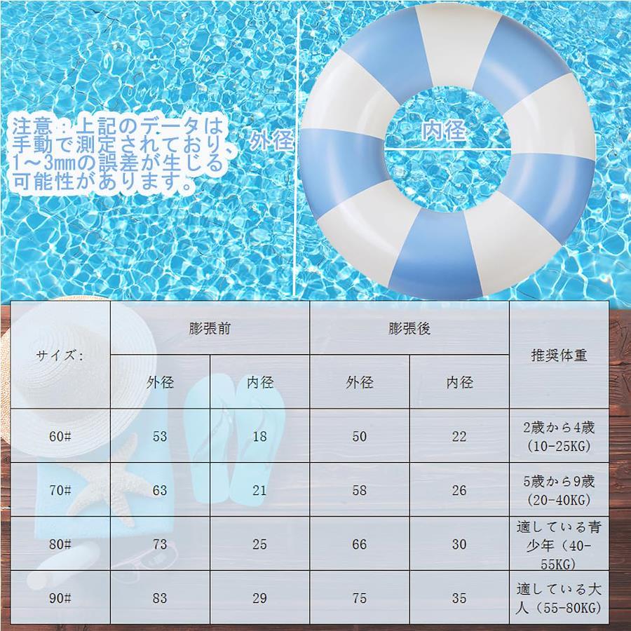 ご注意:本製品は救命器具としては使用されません。必ず保護者のもとでご使用ください。なお、タイヤに空気を入れた後に空気漏れが発生した場合は、速やかに交換または返品させていただきます。対象年齢:60 (2-4歳のお子さま用)、70(5-9歳のお子様)、80 (10-15歳のお子様)、90(16歳以上大人用) 高品質材質:厚手の高品質PVC素材を使用し、優れた耐摩耗性と耐久性を提供します。頻繁に使用しても傷みにくく、長期間にわたって安心してお使いいただけます。 安全性と安定性:大型の防漏気バルブが充気と排気を簡単にし、浮き輪が常に安定して水面に浮かぶことを保証します。リラックスした浮遊体験を存分にお楽しみいただけます。 多機能設計:O型のリング浮き輪は、体を通したり上から乗ったりすることができ、水中で快適に浮遊するのに最適です。夏の爽快感を存分に味わえます。 コンパクトで持ち運び便利:折り畳み可能な設計で、小さくまとまり持ち運びに便利です。プールやビーチ、旅行先での使用に最適です。 ご注意:本製品は救命器具としては使用されません。必ず保護者のもとでご使用ください。なお、タイヤに空気を入れた後に空気漏れが発生した場合は、速やかに交換または返品させていただきます。対象年齢:60 (2-4歳のお子さま用)、70(5-9歳のお子様)、80 (10-15歳のお子様)、90(16歳以上大人用)