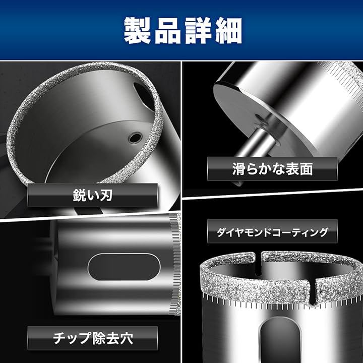 先端に1mm程度の厚い高品質ダイヤモンド砥粒が密着しており、より強いカッティング力を発揮、切れ味や切削加工性に優れ、効率よく穴を開けます。
