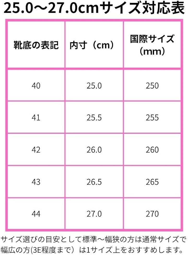 サイズ選びの目安として標準~幅狭の方は通常サイズで、幅広の方(3E程度まで)は1サイズ上をおすすめします。