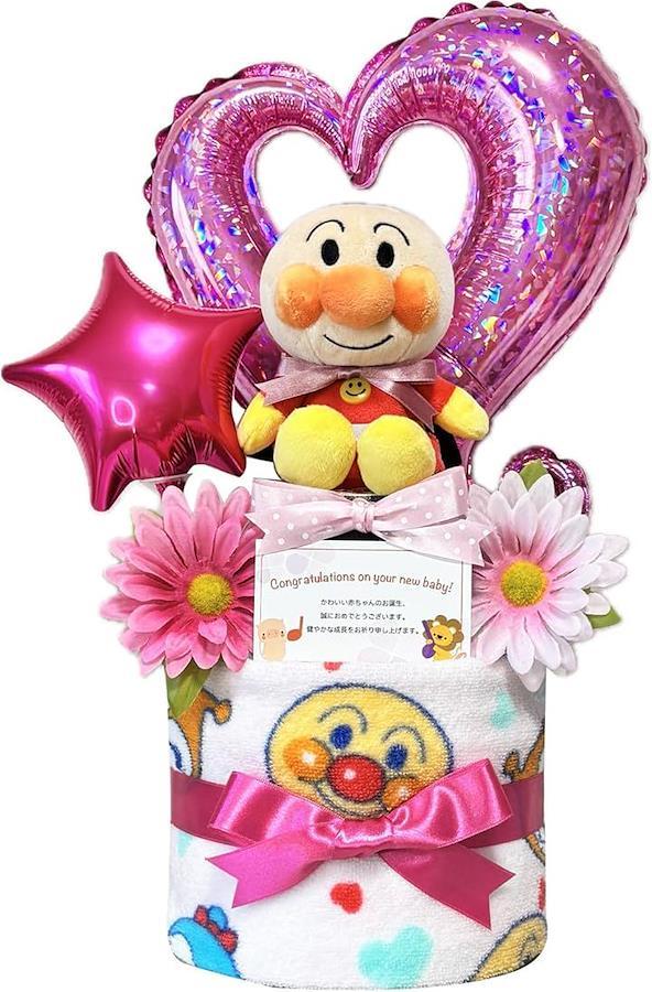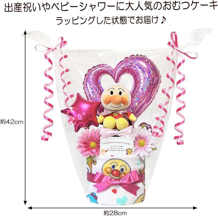 女の子にぴったりの可愛らしい人気キャラクターがデザインされたこのおむつケーキは、キュートさと実用性を兼ね備えています。
