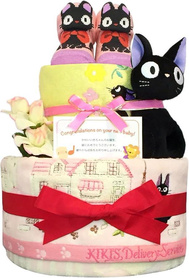 出産祝いに人気の黒ねこのおむつケーキ:スタジオの愛されキャラクターの黒ねこがデザインされたおむつケーキは、赤ちゃんの出産祝いとして人気が高いです。