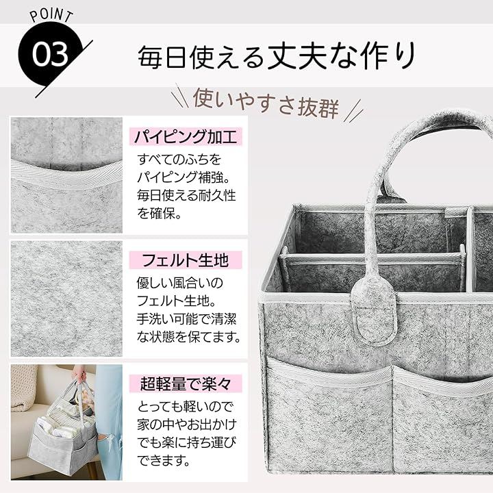 」 丈夫なハンドル付きで、リビングから寝室へ、寝室からお風呂場へと、お世話セット一式をまるごと手軽に持ち運び。