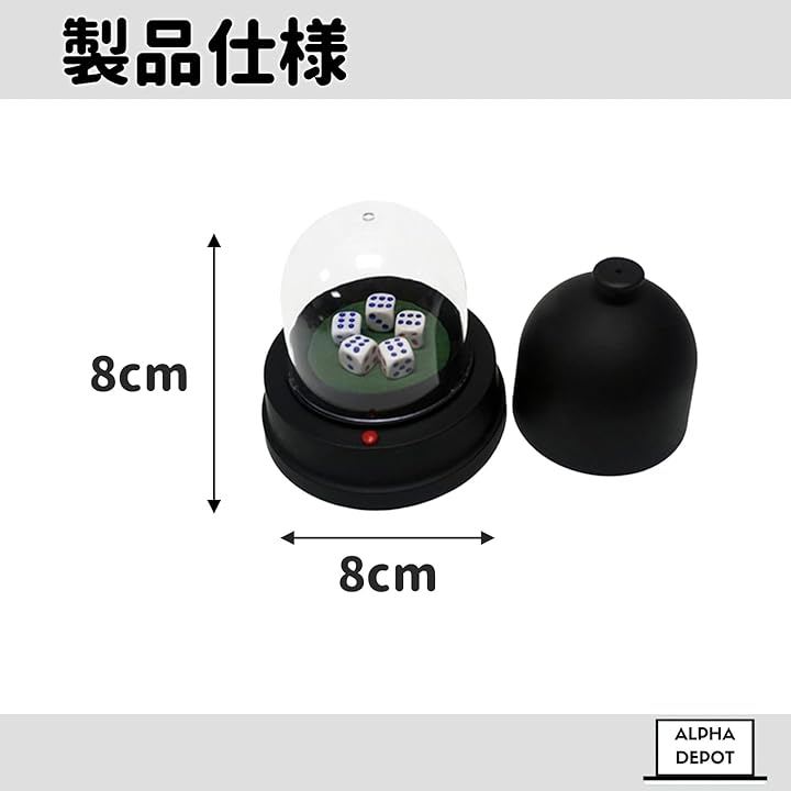 「商品詳細」セット内容:ダイスカップ1個+サイコロ5個 / サイズ:ダイスカップ高さ約8cm/直径約8cm *要単三電池(電池は付属しません)