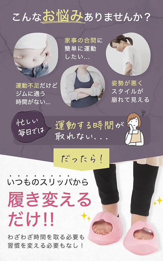 家事や仕事の合間に「履くだけ」で体幹トレーニングができるダイエットスリッパ。