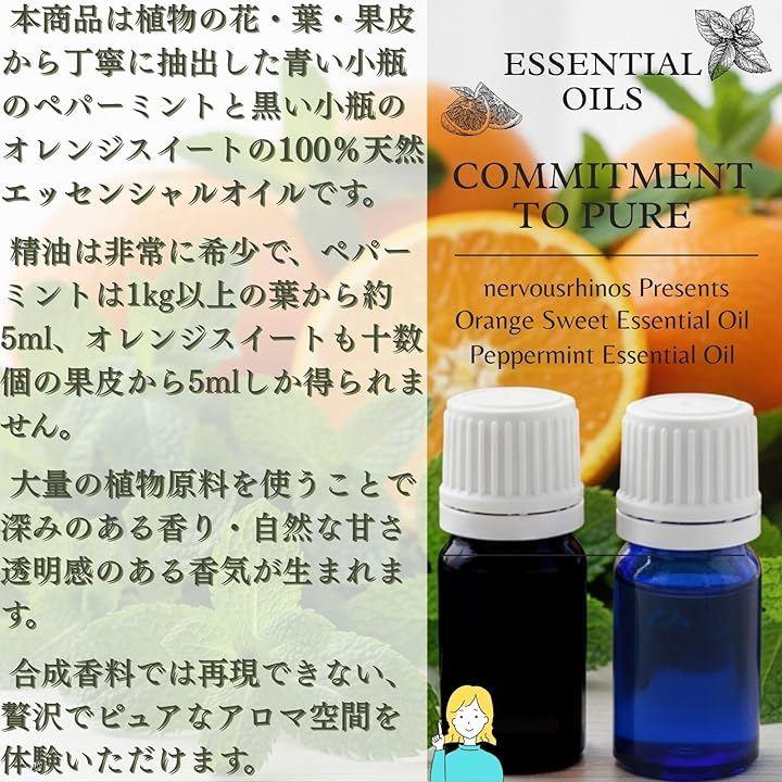 100%エッセンシャルオイル 天然植物から抽出したペパーミントとオレンジスイートの精油2本付き。