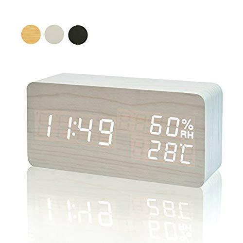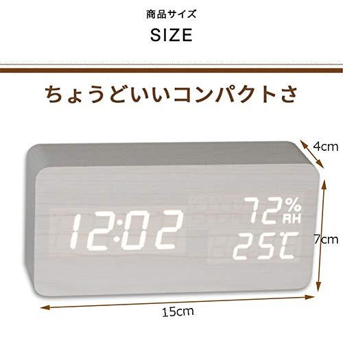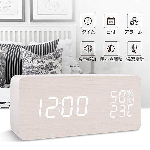 ?多機能付き置き時計 :12時間/24時間二つの時間表示モード/カレンダー/温度/湿度表示/アラーム/音声感知などのいろんな機能を搭載しています。?おしゃれなデザイン:コンパクでシンプルなデザインなので、どんな場所に置くといい雰囲気を作ります。?明るさ3段階調節:LEDの明るさは弱、中、強3段階の調節が可能です。自分のお好きな光度を自由に選択できます。?アラーム/音声感知機能:アラームは「毎日鳴る」と「月曜日 金曜日のみ鳴る」二つモードが設定可能。時計は約12秒経過すると、LEDが消灯しておき、60dB以上の音 (騒音程度) や振動 (手で叩き) を感知した時だけ点灯する設定も可能です。?USB充電式で省エネ:USB接続の電源コードに付くので、パソコンなどのUSB端子に接続しまたはスマホの充電器に挿して直コンセントから給電可能。時計の内部は電池取り付け機能に付き、停電等の非常時でも使えます。
