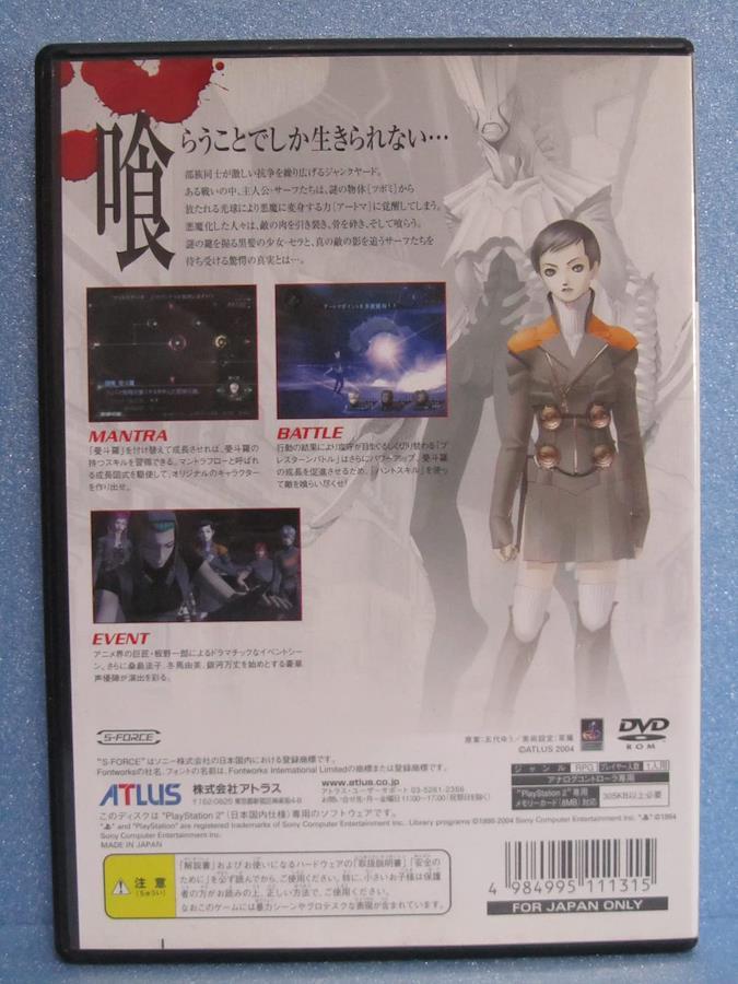 アトラスの名作RPG『真・女神転生』シリーズの流れをくみつつ、新たな世界観を盛り込んだのが本作である。人間が悪魔化して戦いそれぞれの必殺技も多彩だ。謎の少女「セラ」の記憶を取り戻さなければならない。 至上の世界ニルヴァーナを目指して悪魔となった人間同士が喰らい合う…それが人間を統治するカルマ教会の命令だった。そんな中に記憶を失った謎の黒髪の少女セラが現れる。彼女は仲間を悪魔化させない不思議な力を持っていたのである。この世界の先には楽園が果たして待っているのか…。 デザインは女神転生シリーズでおなじみの悪魔絵師の称号を持つ金子一馬氏。そしてイベントシーンでは桑島法子、冬馬由真、銀河万丈など豪華声優陣がこのメガテンの世界観を盛り上げる。(樋口浩二)
