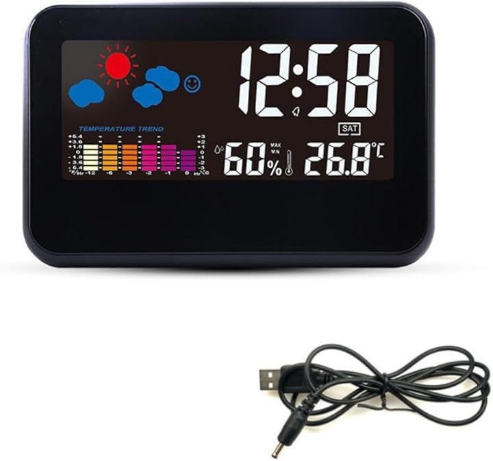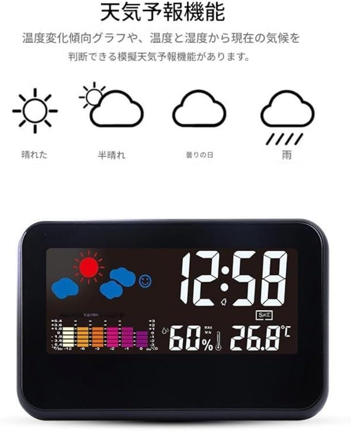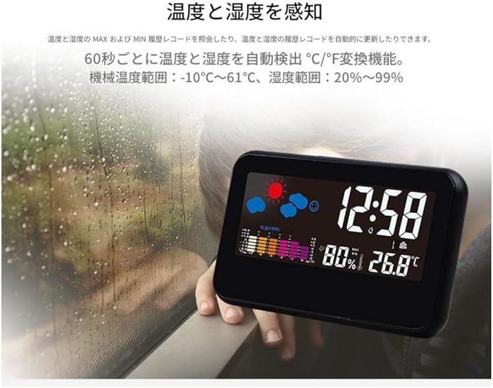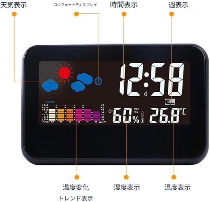 「大画面温湿度計デジタル時計」見やすい大型LCDディスプレイで時刻、日付、天気、温度、湿度、快適指数を確認できるデジタル時計です。