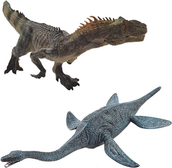 凶暴な性格の肉食恐竜アロサウルスとプレシオサウルスのフィギュア2個セットです。