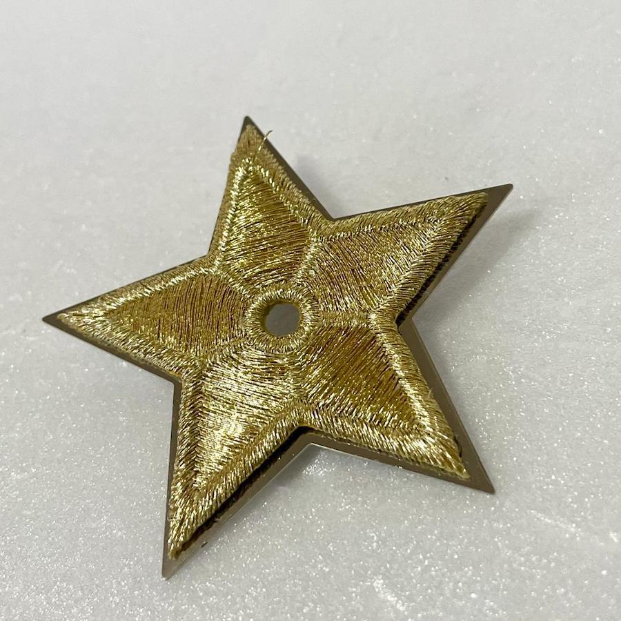 特にロゴ付近や星の角部分に目視できる擦れがありますが、表面のゴールド刺繍部分には目立つほつれや汚れはなく、大変綺麗な状態です。裏面の金属地金部分に細かな擦れ傷や小傷が見受けられます。