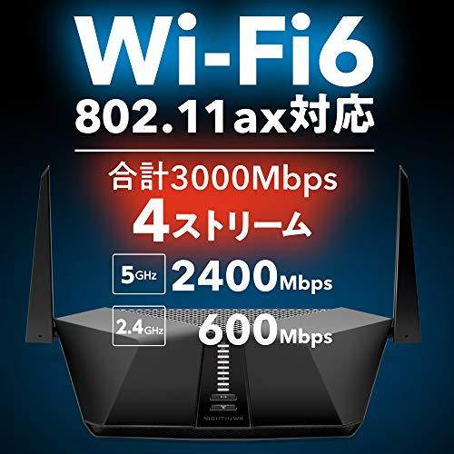 【次世代規格Wi-Fi6対応エントリーモデル】Nighthawk AX4は次世代規格 802.11AX (Wi-Fi6)に対応したエントリーモデル。2400Mbps+600Mbpsの使いやすいスペック。【複数同時に接続しても遅くならない】4X4 MU-MIMOにより複数のデバイスで同時に動画再生をしても快適。【強力で安定したWiFiをより広範囲へ】高性能アンテナx2により従来よりも広い範囲をカバー。【従来の機器も高速に】Wi-Fi6ではより効率的な通信を実現。Wi-Fi6未対応のデバイスでも速度の向上を体感できます。【動画もゲームも】OFDMAで複数のデバイスが接続されても通信が遅くなりにくく、パワフルなCPUは安定した高速通信を提供します。【専用アプリで簡単セットアップ】NETGEAR Nighthawkアプリでルーターのセットアップや管理がカンタン。【安心の日本語サポートと3年保証】ネットギアのサポート窓口は365日年中無休で対応(購入後サポートの際には無償ユーザ登録が必要です)