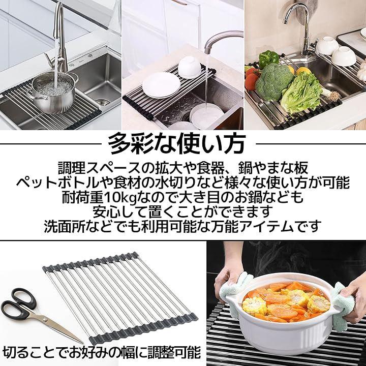「多彩な使い方」 調理スペースの拡大や食器、鍋やまな板、ペットボトル、野菜などの食材の水切りなど、多岐にわたる使い方が可能。