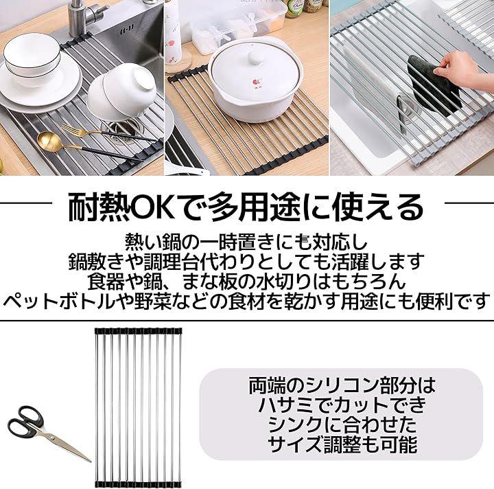 食器や鍋、まな板の水切りはもちろん、ペットボトルや野菜などの食材を乾かす用途にも便利です。