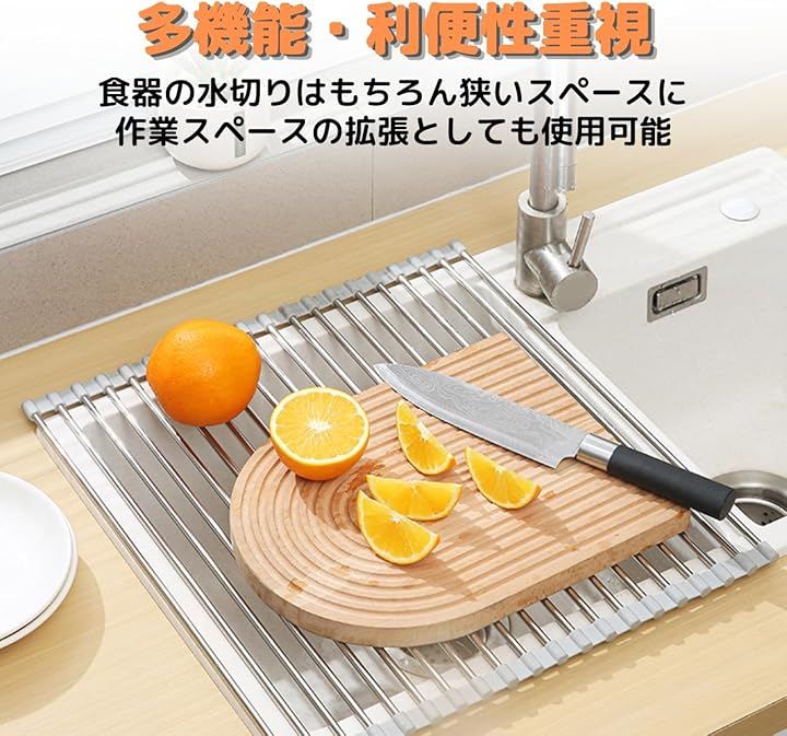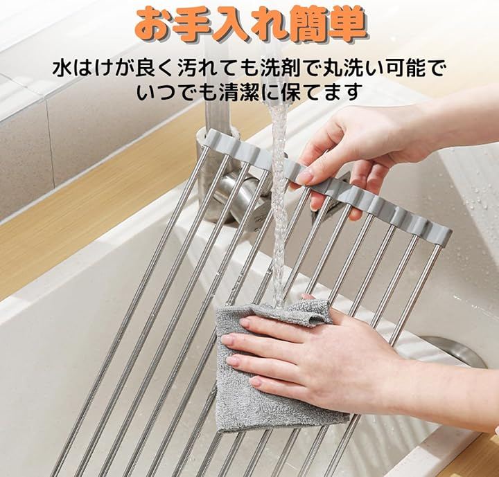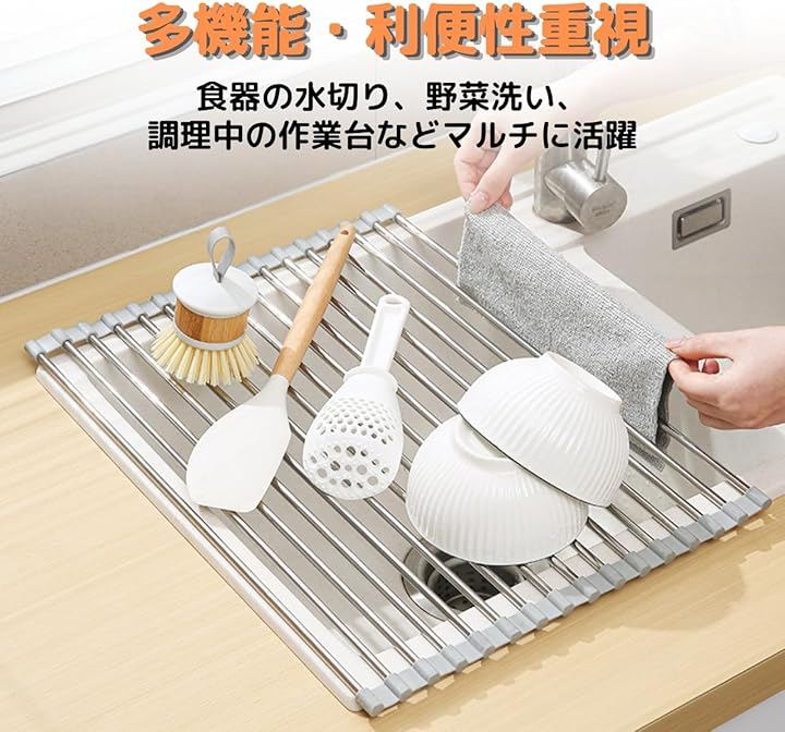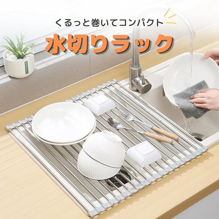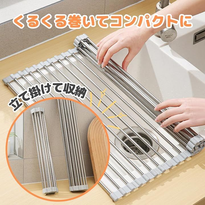 「省スペース・収納重視」くるくる丸めてキッチン広々 キッチンが狭いお悩みを解決する、くるくる丸めてコンパクトに収納可能な水切りラックです。