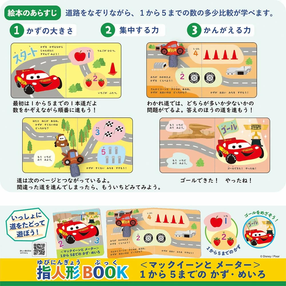【商品情報】それぞれ指人形2個と学びのあるオリジナルストーリーの絵本がついています。読み聞かせなどをしながら一緒に楽しい時間を共有し想像力を育めます。【ミッキー&フレンズ】は、季節のおでかけをテーマに言葉のひびきや生活習慣。【ラプンツェル】は誕生日のいちにちを通して、日常のあいさつや生活習慣。【トイ・ストーリー】は一緒にかくれんぼをしながら、ものの名前や色の名前。【カーズ】は道路をなぞりながら1から5までのかずの多少比較が学べます。【ミッキー&フレンズ】と【トイ・ストーリー】は穴あき絵本です。