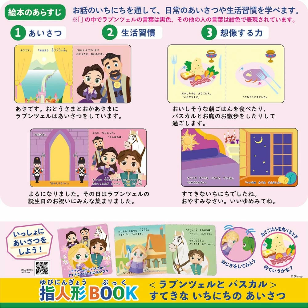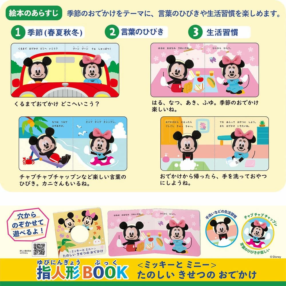 【商品情報】それぞれ指人形2個と学びのあるオリジナルストーリーの絵本がついています。読み聞かせなどをしながら一緒に楽しい時間を共有し想像力を育めます。【ミッキー&フレンズ】は、季節のおでかけをテーマに言葉のひびきや生活習慣。【ラプンツェル】は誕生日のいちにちを通して、日常のあいさつや生活習慣。【トイ・ストーリー】は一緒にかくれんぼをしながら、ものの名前や色の名前。【カーズ】は道路をなぞりながら1から5までのかずの多少比較が学べます。【ミッキー&フレンズ】と【トイ・ストーリー】は穴あき絵本です。