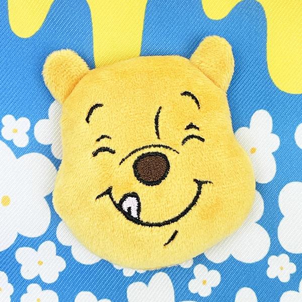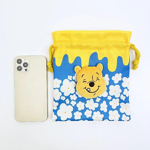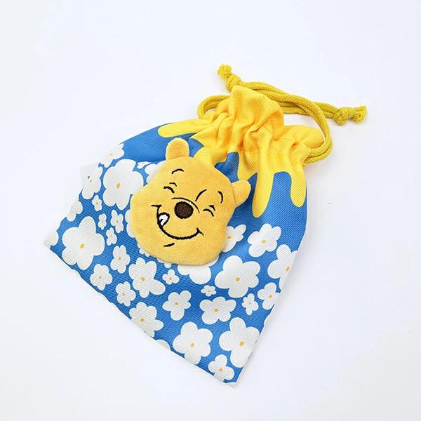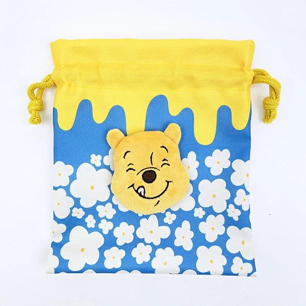 プーさんの表情がかわいいファニーフェイス柄と、帽子姿がたまらないパジャマ柄♪どちらの柄にも真ん中にプーさんのぬいぐるみがついた立体的な巾着です♪