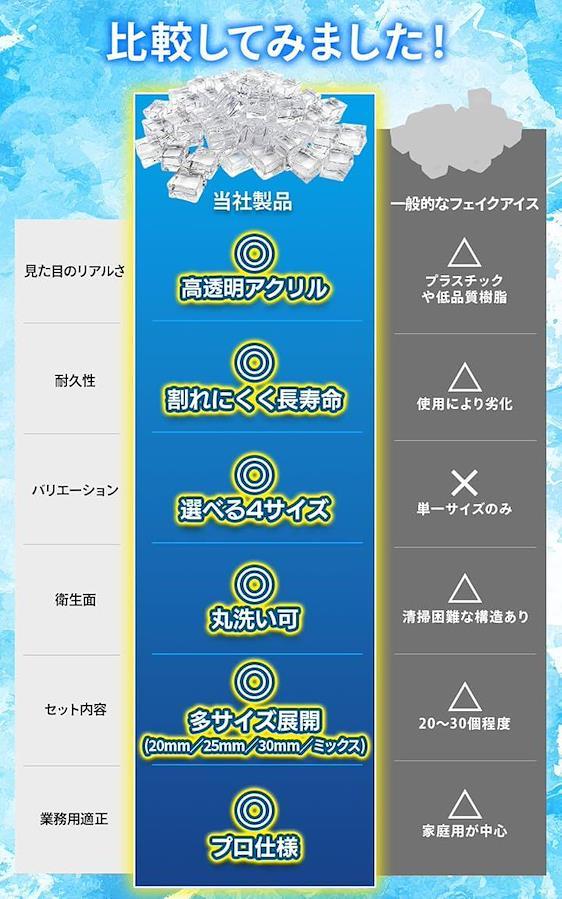 繰り返し使えるサンプル氷」このディスプレイ氷のセットは何度使用しても破損しないよう耐久性が高く設計されていて、再利用可能なアクリル素材であるため、飲食店やイベント会場などで頻繁に使用する場合も、氷を何度でも繰り返し使用することができます。