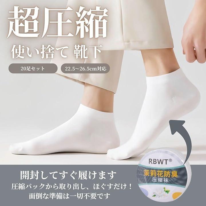 「持ち運びラクラクの圧縮設計」 使い捨て靴下は1足ずつ手のひらサイズに圧縮されており、旅行バッグや防災バッグ、出張用スーツケースにもスッキリ収まります。
